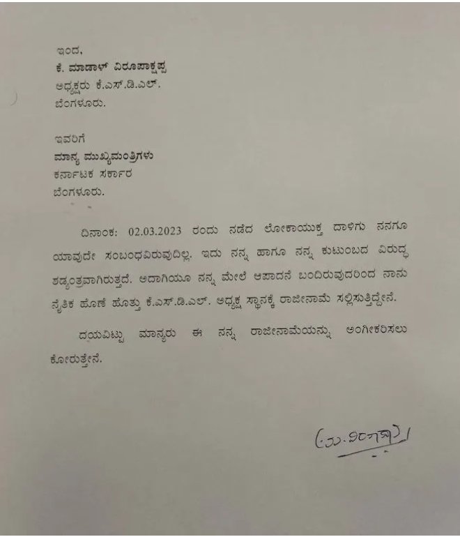 ಲಂಚ ಪ್ರಕರಣದಲ್ಲಿ ತಮ್ಮ ಪುತ್ರ ಬಂಧನವಾದ ಬೆನ್ನಲ್ಲೇ ಶಾಸಕ ಮಾಡಾಳ್ ವಿರೂಪಾಕ್ಷಪ್ಪ ತಮ್ಮ ಕೆಎಸ್.ಡಿ.ಎಲ್ ಅಧ್ಯಕ್ಷ ಸ್ಥಾನಕ್ಕೆ ರಾಜೀನಾಮೆ ನೀಡಿದ್ದಾರೆ.
