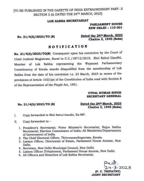ಲೋಕಸಭೆಯ ಸೆಕ್ರೆಟರಿ ಜನರಲ್ ಉತ್ಪಲ್ ಕುಮಾರ್ ಸಿಂಗ್ ಅವರು ಹೊರಡಿಸಿರುವ ಅಧಿಸೂಚನೆಯಲ್ಲಿ ಸಿ.ಸಿ18712/2019ರಲ್ಲಿ ಸೂರತ್ ಚೀಫ್ ಜುಡಿಷಿಯಲ್ ಮ್ಯಾಜಿಸ್ಟ್ರೇಟ್ ನ್ಯಾಯಾಲಯವು ಅವರಿಗೆ ಶಿಕ್ಷೆ ವಿಧಿಸಿತ್ತು.