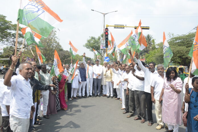 ರಾಹುಲ್ಗಾಂಧಿ ಅವರನ್ನು ಸಂಸದ ಸ್ಥಾನದಿಂದ ಅನರ್ಹಗೊಳಿಸಿರುವುದನ್ನು ಖಂಡಿಸಿ, ಜಿಲ್ಲಾ ಕಾಂಗ್ರೆಸ್ನ ಅಧ್ಯಕ್ಷ ಚಂದ್ರಶೇಖರಗೌಡ ನೇತೃತ್ವದಲ್ಲಿ ತುಮಕೂರಿನ ಭದ್ರಮ್ಮ ವೃತ್ತದಲ್ಲಿ ಪ್ರತಿಭಟನೆ ನಡೆಸಿದರು.