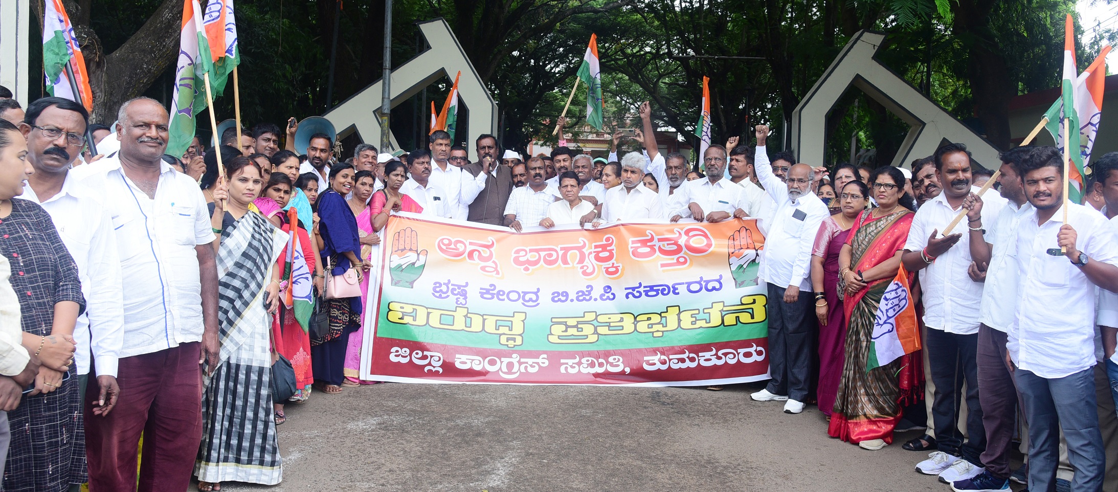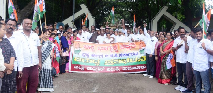 ತುಮಕೂರಿನ ಟೌನ್ಹಾಲ್ ವೃತ್ತದಲ್ಲಿ ಜಿಲ್ಲಾ ಕಾಂಗ್ರೆಸ್ ವತಿಯಿಂದ ಅನ್ನಭಾಗ್ಯ ಯೋಜನೆಗೆ ಅಕ್ಕಿ ನೀಡಲು ನಿರಾಕರಿಸಿದ ಕೇಂದ್ರ ಸರ್ಕಾರದ ವಿರುದ್ದ ಹಮ್ಮಿಕೊಂಡಿದ್ದ ಪ್ರತಿಭಟನೆಯಲ್ಲಿ ಭಾಗವಹಿಸಿ ಅವರು ಮಾತನಾಡಿ ರಾಜ್ಯದಲ್ಲಿ ಕಾಂಗ್ರೆಸ್ ಪಕ್ಷದ ಸರ್ಕಾರ ಅಧಿಕಾರಕ್ಕೆ ಬಂದ ನಂತರ ಪಡಿತರ ಹಕ್ಕಿ ಪೂರೈಸುವ ಎಫ್.ಸಿ.ಐಗೆ ಪತ್ರ ಬರೆದು ಅಕ್ಕಿ ಪೂರೈಸುವಂತೆ ಮಾಡಿದ ಮನವಿ ಒಪ್ಪಿಗೆ ಸೂಚಿಸಿದ 24 ಗಂಟೆಯೊಳಗೆ ಕೇಂದ್ರದ ಒತ್ತಡಕ್ಕೆ ಮಣಿದು ಅಕ್ಕಿ ಪೂರೈಸಲು ನಿರಾಕರಿಸಿದೆ ಎಂದು ದೂರಿದರು.