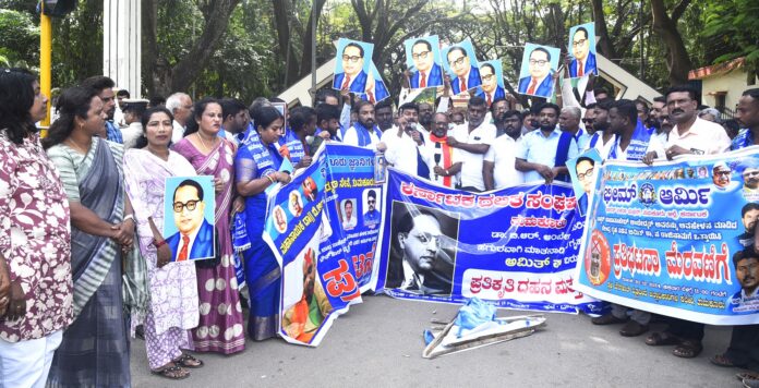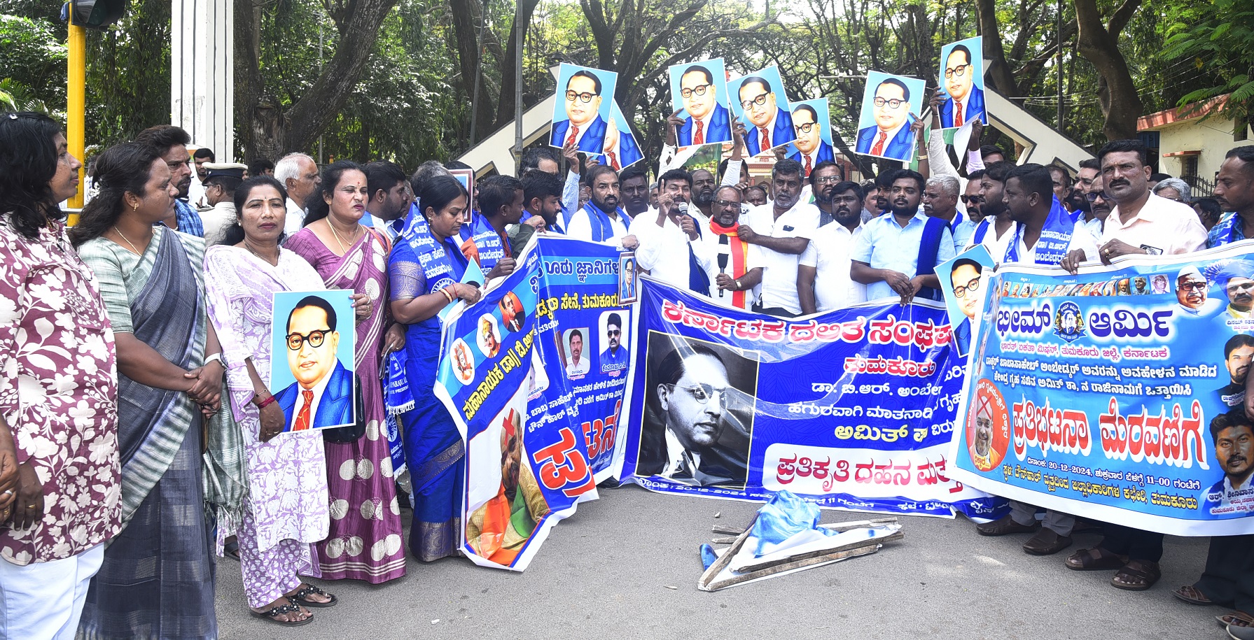 ಸಂಸತ್ತಿನಲ್ಲಿ ಸಂವಿಧಾನ ಶಿಲ್ಪಿ ಡಾ. ಬಿ.ಆರ್. ಅಂಬೇಡ್ಕರ್ ಅವರ ಬಗ್ಗೆ ಲಘುವಾಗಿ ಮಾತನಾಡಿರುವ ಕೇಂದ್ರ ಗೃಹ ಸಚಿವ ಅಮಿತ್ ಶಾ ಅವರ ರಾಜೀನಾಮೆಗೆ ಆಗ್ರಹಿಸಿ ಜಿಲ್ಲಾ ಕಾಂಗ್ರೆಸ್ ಸಮಿತಿ, ಮಹಾನಾಯಕ ಡಾ. ಬಿ.ಆರ್. ಅಂಬೇಡ್ಕರ್ ಪ್ರಜಾ ಸೇನೆ, ಆಲ್ ಇಂಡಿಯಾ ಬಹುಜನ ಸಮಾಜದ ಪಾರ್ಟಿ ಸೇರಿದಂತೆ ವಿವಿಧ ದಲಿತ ಪರ ಸಂಘಟನೆಗಳ ಮುಖಂಡರು ತುಮಕೂರಿನಲ್ಲಿ ಪ್ರತಿಭಟನೆ ನಡೆಸಿದರು.