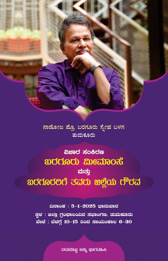 ನಾಡೋಜ ಪ್ರೊ.ಬರಗೂರು ಸ್ನೇಹ ಬಳಗದ ವತಿಯಿಂದ ಬರಗೂರು ಮೀಮಾಂಸೆ ಮತ್ತು ಬರಗೂರರಿಗೆ ತವರು ಜಿಲ್ಲೆಯ ಗೌರವ ಕುರಿತ ವಿಚಾರ ಸಂಕಿರಣವನ್ನು ಜ.5, 2025ರಂದು ತುಮಕೂರು ನಗರದ ಜಿಲ್ಲಾ ಗ್ರಂಥಾಲಯದ ಸಭಾಂಗಣದಲ್ಲಿ ಹಮ್ಮಿಕೊಳ್ಳಲಾಗಿದೆ.