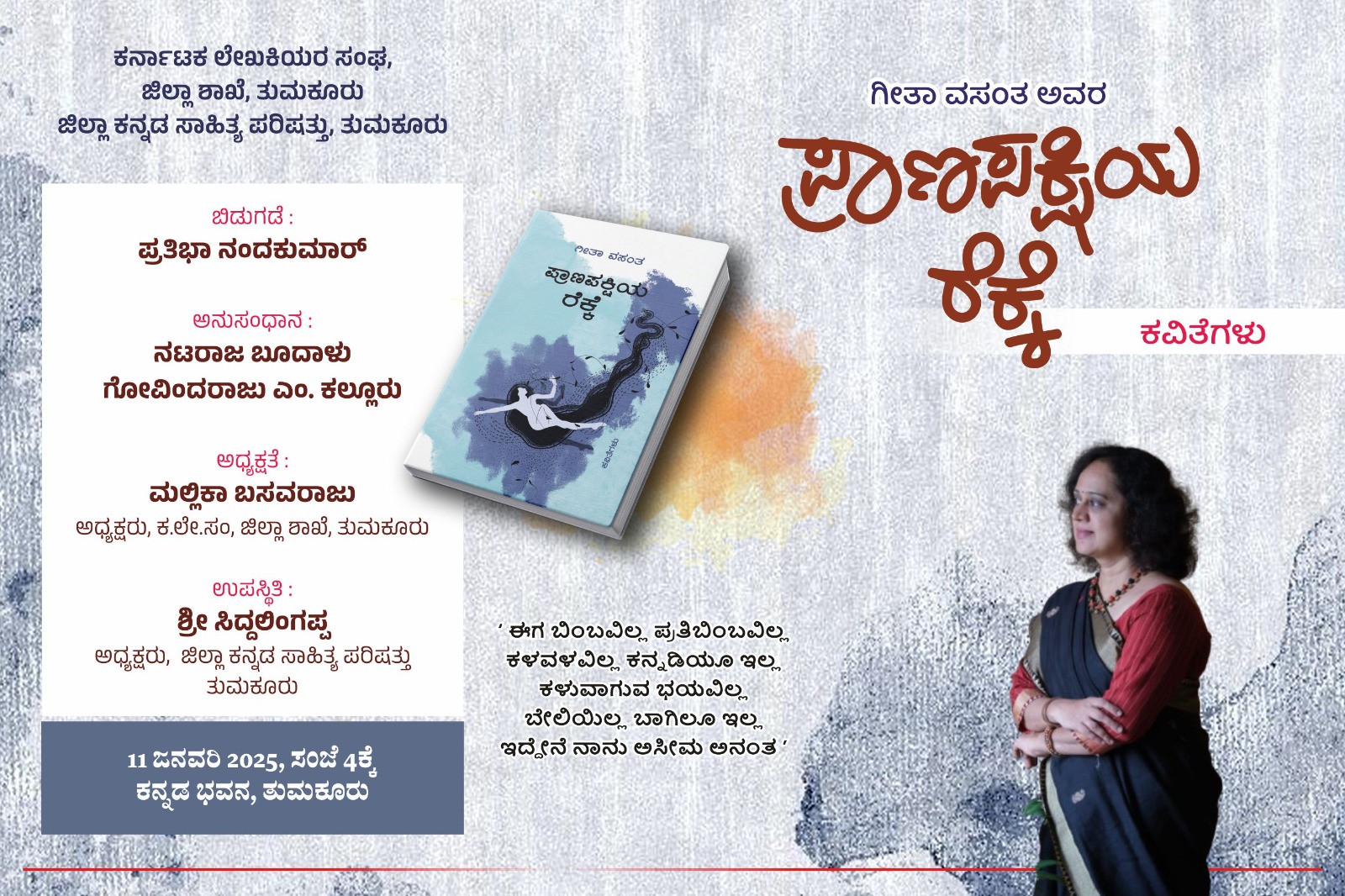 ಕರ್ನಾಟಕ ಲೇಖಕಿಯರ ಸಂಘದ ತುಮಕೂರು ಜಿಲ್ಲಾ ಶಾಖೆ ಮತ್ತು ತುಮಕೂರು ಜಿಲ್ಲಾ ಕನ್ನಡ ಸಾಹಿತ್ಯ ಪರಿಷತ್ ವತಿಯಿಂದ ಲೇಖಕಿ ಗೀತಾ ವಸಂತ್ ಬರೆದಿರುವ ‘ಪ್ರಾಣಪಕ್ಷಿಯ ರೆಕ್ಕೆ’ ಪುಸ್ತಕ ಬಿಡುಗಡೆ ಕರ್ಯಕ್ರಮವನ್ನು ಜನವರಿ 11ರಂದು ಸಂಜೆ 4 ಗಂಟೆಗೆ ತುಮಕೂರು ನಗರದ ಕನ್ನಡ ಭವನದಲ್ಲಿ ಹಮ್ಮಿಕೊಳ್ಳಲಾಗಿದೆ.