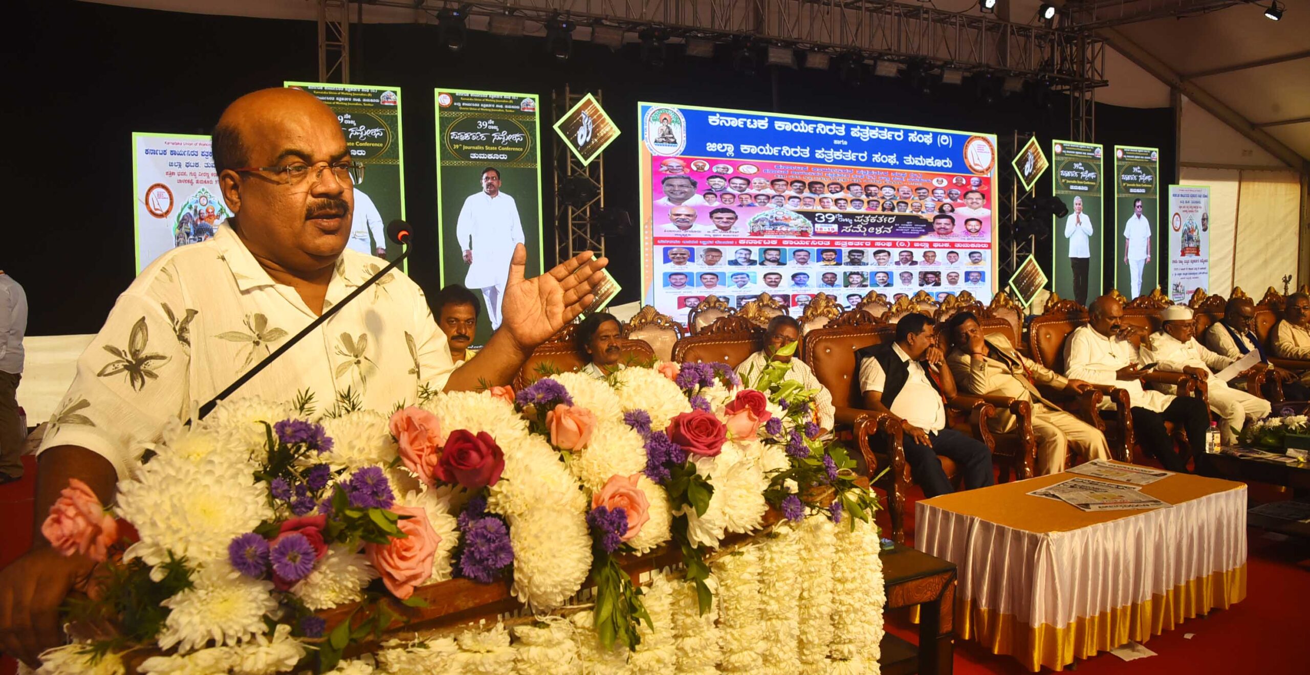 ತುಮಕೂರಿನಲ್ಲಿ ಹಮ್ಮಿಕೊಂಡಿರುವ 39ನೆಯ ರಾಜ್ಯ ಪತ್ರಕರ್ತರ ಸಮ್ಮೇಳನದ ವಿಚಾರಗೋಷ್ಟಿಯಲ್ಲಿ ‘ಸಂವಿಧಾನ ಮತ್ತು ಮಾಧ್ಯಮ’ ಕುರಿತು ವಿಷಯ ಮಂಡಿಸಿದ ಅವರು, ಇಂದು ಮಾಧ್ಯಮ ಕೇವಲ ಮಾಧ್ಯಮವಾಗಿ ಉಳಿದಿಲ್ಲ, ಸಂವಿಧಾನ ಜನಸಾಮಾನ್ಯರಿಗೆ ನೀಡಿರುವ ಹಕ್ಕು ಮತ್ತು ಕರ್ತವ್ಯಗಳಂತೆಯೇ ಪತ್ರಕರ್ತರಿಗೂ ಹಕ್ಕು ಮತ್ತು ಕರ್ತವ್ಯಗಳನ್ನು ನೀಡಿದೆ. ಸಂವಿಧಾನ ಹೇಗೆ ಮಾಧ್ಯಮವನ್ನು ರಕ್ಷಿಸುತ್ತದೆಯೋ ಹಾಗೆಯೇ ಮಾಧ್ಯಮವೂ ಸಂವಿಧಾನವನ್ನು ರಕ್ಷಿಸಬೇಕು ಎಂದರು.