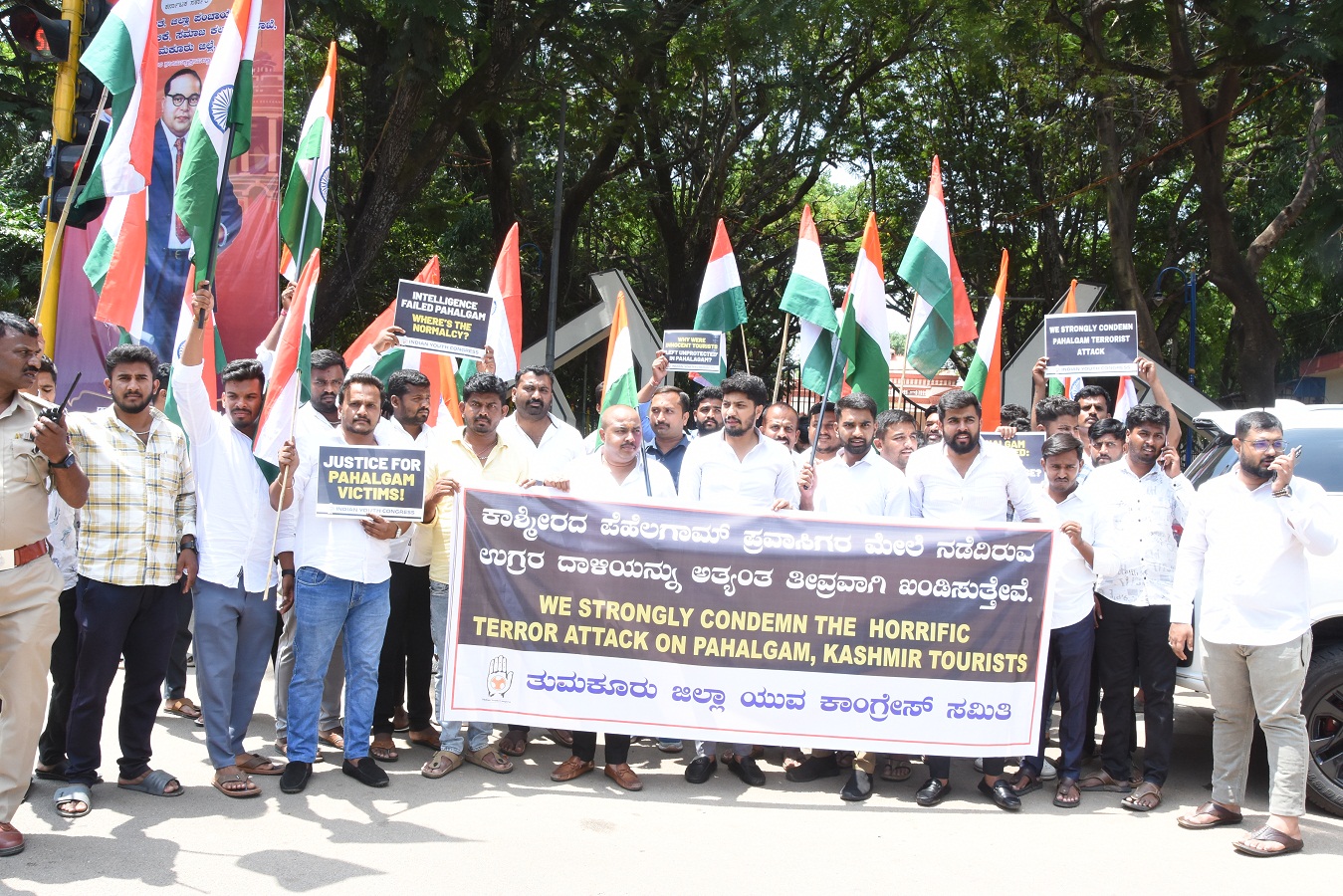 ಕಾಶ್ಮೀರದ ಪಹಲ್ಗಾಮ್ನಲ್ಲಿ ಪ್ರವಾಸಿಗರ ಮೇಲೆ ಭಯೋತ್ಪಾದಕರು ನಡೆಸಿದ ದಾಳಿ ಖಂಡಿಸಿ ಜಿಲ್ಲಾ ಯುವ ಕಾಂಗ್ರೆಸ್ ಕಾರ್ಯಕರ್ತರು ಗುರುವಾರ ತುಮಕೂರು ನಗರದಲ್ಲಿ ರಾಷ್ಟ್ರಧ್ವಜ ಪ್ರದರ್ಶಿಸುತ್ತಾ ಶಾಂತಿಯುತ ಮೆರವಣಿಗೆ ನಡೆಸಿದರು.