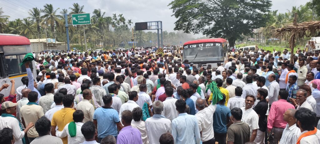 ಕೆಎಸ್ಸಾರ್ಟಿಸಿ ಬಸ್ನ ಟೈರ್ ಗಾಳಿ ಬಿಟ್ಟು ಪ್ರತಿಭಟನೆ ನಡೆಸಿದ ನೂರಾರು ರೈತರು ಸರ್ಕಾರ ಹಾಗೂ ಜಿಲ್ಲಾಡಳಿತದ ಕ್ರಮದ ವಿರುದ್ಧ ಧಿಕ್ಕಾರ ಕೂಗಿದರು.