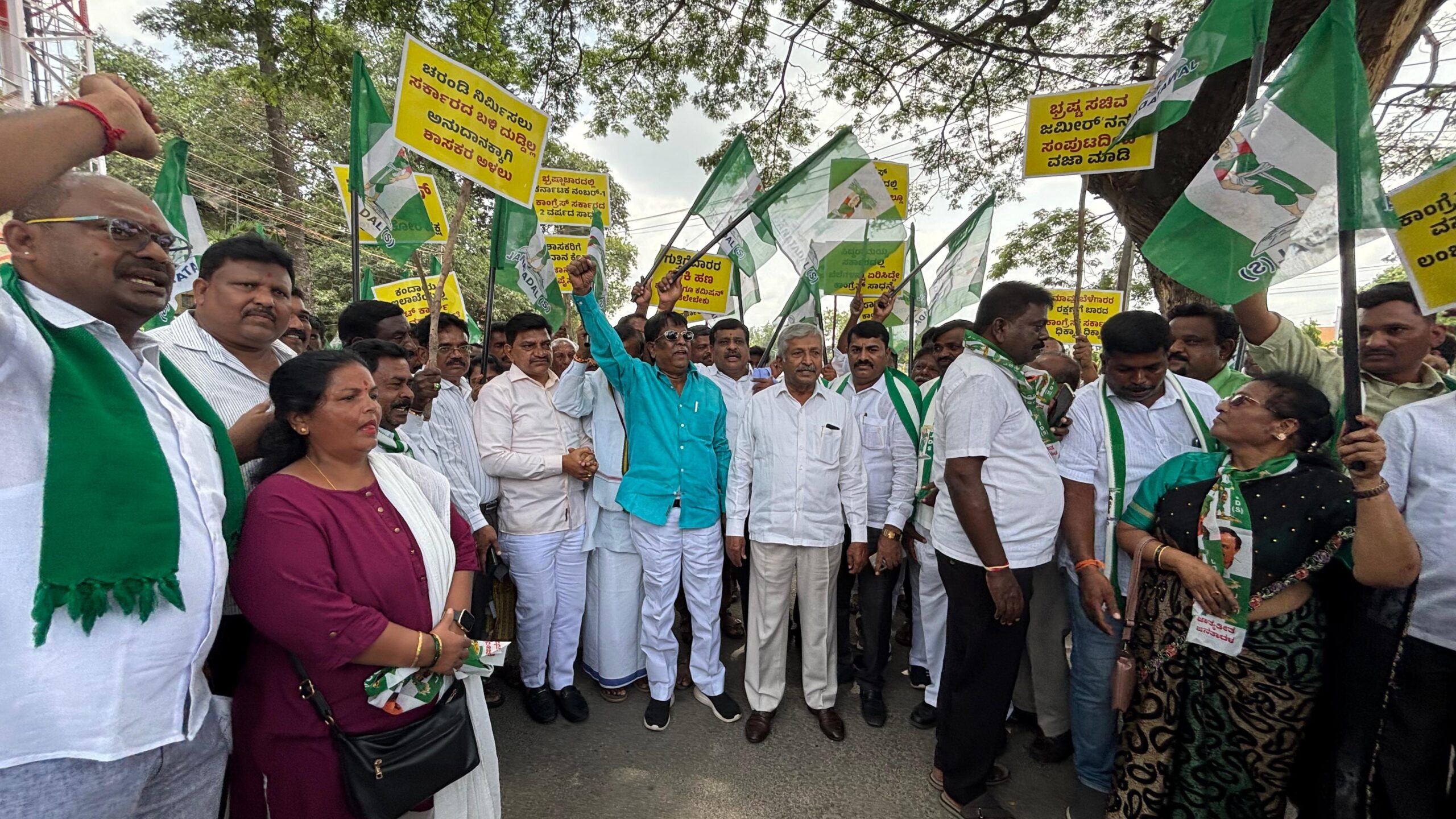 ರಾಜ್ಯ ಕಾಂಗ್ರೆಸ್ ಸರ್ಕಾರದ ಜನವಿರೋಧಿ ನೀತಿ ಖಂಡಿಸಿ, ಎಲ್ಲಾ ಇಲಾಖೆಗಳಲ್ಲೂ ಲಂಚಗುಳಿತನ, ಭ್ರಷ್ಟಾಚಾರ ತುಂಬಿದೆ ಎಂದು ಆಪಾದಿಸಿ ಜಿಲ್ಲಾ ಜೆಡಿಎಸ್ ಮುಖಂಡರು ಶನಿವಾರ ನಗರದಲ್ಲಿ ಪ್ರತಿಭಟನೆ ನಡೆಸಿ ಸರ್ಕಾರದ ವಿರುದ್ಧ ಕಾನೂನು ಕ್ರಮ ತೆಗೆದುಕೊಳ್ಳುವಂತೆ ರಾಜ್ಯಪಾಲರಿಗೆ ಮನವಿ ಮಾಡಿದರು.