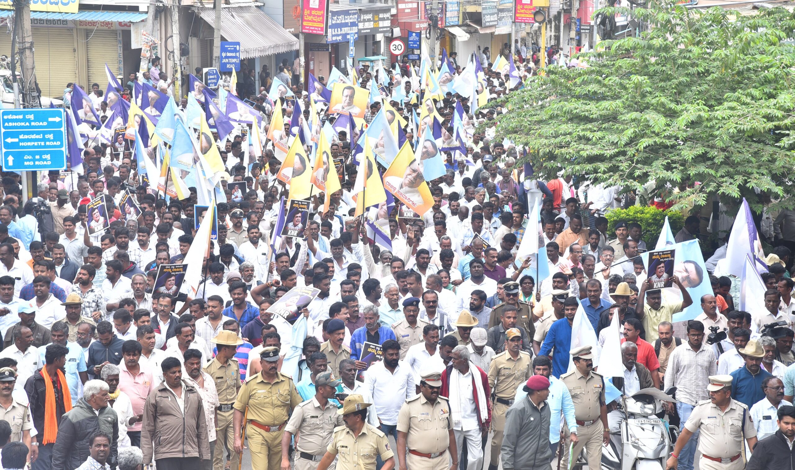 ಟೌನ್ಹಾಲ್ ವೃತ್ತದಲ್ಲಿ ದೊಡ್ಡ ಸಂಖ್ಯೆಯಲ್ಲಿ ಜಮಾಯಿಸಿದ ಕೆಎನ್ಆರ್ ಅಭಿಮಾನಿಗಳು, ಮಧುಗಿರಿ ಕ್ಷೇತ್ರದ ಕಾರ್ಯಕರ್ತರು ಕೆಎನ್ಆರ್ ಪರ ಘೋಷಣೆಗಳನ್ನು ಕೂಗುತ್ತಾ ಬಿ.ಹೆಚ್. ರಸ್ತೆ ಮುಖೇನ ಎಂ.ಜಿ. ರಸ್ತೆಯಲ್ಲಿ ಪ್ರತಿಭಟನಾ ಮೆರವಣಿಗೆಯಲ್ಲಿ ಸಾಗಿ ಜಿಲ್ಲಾಧಿಕಾರಿಗಳ ಕಚೇರಿ ತಲುಪಿ, ಜಿಲ್ಲಾಧಿಕಾರಿಗಳಿಗೆ ಮನವಿ ಸಲ್ಲಿಸಿದರು.
