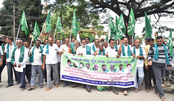ರಾಜ್ಯ ರೈತ ಸಂಘದ ತುಮಕೂರು ಜಿಲ್ಲಾಧ್ಯಕ್ಷ ಎ. ಗೋವಿಂದರಾಜು ಮಾತನಾಡಿ, ಕಳೆದ 8 ದಿನಗಳಿಂದ ಬೆಳಗಾವಿಯಲ್ಲಿ ರೈತರು ಪ್ರತಿ ಟನ್ ಕಬ್ಬಿಗೆ 3500 ರೂ. ದರ ನಿಗದಿಪಡಿಸಬೇಕು ಎಂದು ಆಗ್ರಹಿಸಿ ಅಹೋರಾತ್ರಿ ಧರಣಿ ನಡೆಸುತ್ತಿದ್ದಾರೆ. ಆದರೆ ಸರ್ಕಾರ ಕಬ್ಬು ಬೆಳೆಗಾರರ ಬೇಡಿಕೆಯನ್ನು ನಿರ್ಲಕ್ಷ್ಯ ಮಾಡಿದೆ ಎಂದು ಆರೋಪಿಸಿದರು.