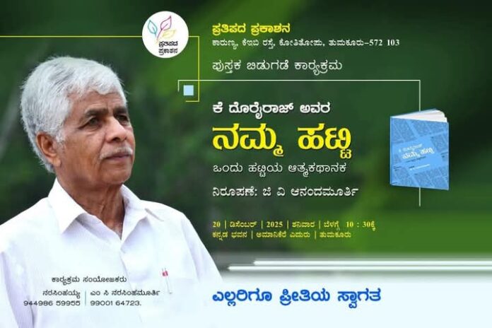 ಪ್ರತಿಪದ ಪ್ರಕಾಶನದ ವತಿಯಿಂದ ಜನಪರ ಚಿಂತಕ ಕೆ.ದೊರೈರಾಜ್ ಅವರ ‘ನಮ್ಮ ಹಟ್ಟಿ’ ಒಂದು ಹಟ್ಟಿಯ ಆತ್ಮಕಥಾನಕ ಕೃತಿ ಬಿಡುಗಡೆ ಸಮಾರಂಭ ಡಿ.20ರಂದು ಬೆಳಗ್ಗೆ 10.30 ಗಂಟೆಗೆ ತುಮಕೂರಿನ ಅಮಾನಿಕೆರೆ ಸಮೀಪವಿರುವ ಕನ್ನಡ ಭವನದಲ್ಲಿ ಹಮ್ಮಿಕೊಳ್ಳಲಾಗಿದೆ.