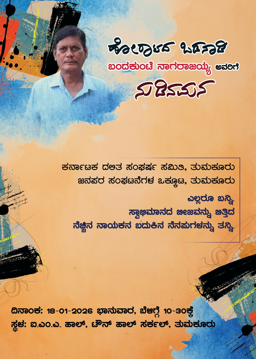 ಕರ್ನಾಟಕ ದಲಿತ ಸಂಘರ್ಷ ಸಮಿತಿ ತುಮಕೂರು ಮತ್ತು ಜನಪರ ಸಂಘಟನೆಗಳ ಒಕ್ಕೂಟದ ವತಿಯಿಂದ ಇತ್ತೀಚೆಗೆ ನಿಧನರಾದ ಹೋರಾಟದ ಒಡನಾಡಿ, ದಲಿತ ಮುಖಂಡ ಬಂದಕುಂಟೆ ನಾಗರಾಜಯ್ಯ ಅವರಿಗೆ ನುಡಿನಮನ ಕಾರ್ಯಕ್ರಮವನ್ನು ಜ.18ರಂದು ಬೆಳಗ್ಗೆ 10.30ಗಂಟೆಗೆ ತುಮಕೂರಿನ ಟೌನ್ ಹಾಲ್ ಸರ್ಕಲ್ ನಲ್ಲಿರುವ ಐಎಂಎ ಹಾಲ್ ನಲ್ಲಿ ಏರ್ಪಡಿಸಲಾಗಿದೆ.