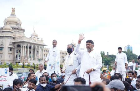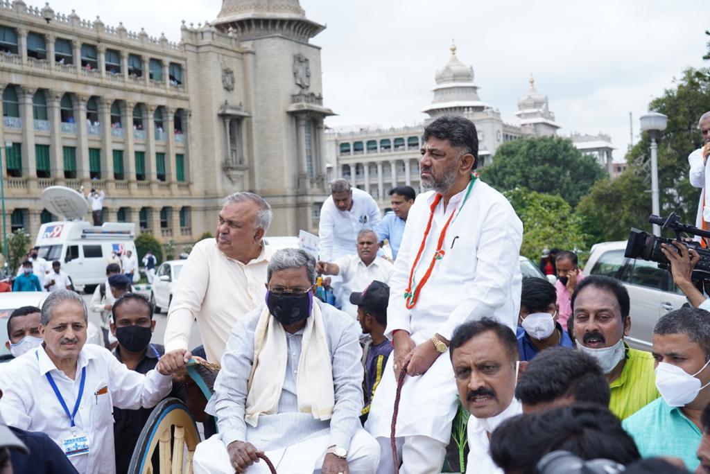 ಬೆಲೆ ಹೆಚ್ಚಳದಿಂದ ಜನ ತತ್ತರಿಸಿದ್ದರೂ ಅದಕ್ಕೆ ಸ್ಪಂದಿಸದ ಬಿಜೆಪಿ ಸರ್ಕಾರದ ವಿರುದ್ಧ ಕಾಂಗ್ರೆಸ್ ನಾಯಕರು ಟಾಂಗಾ ಜಾಥಾ ನಡೆಸುವ ಮೂಲಕ ಪ್ರತಿಭಟನೆ ವ್ಯಕ್ತಪಡಿಸಿದರು. ಕಾಂಗ್ರೆಸ್ ಕಚೇರಿಯಿಂದ ವಿಧಾನಸೌಧದವರೆಗೆ ಜಾಥಾದಲ್ಲಿ ಬಂದು ಜನವಿರೋಧಿ ನೀತಿ ಮೂಲಕ ಜನರ ಬದುಕು ದುಸ್ಥಿತಿಗೆ ನೂಕುತ್ತಿರುವ ಬಿಜೆಪಿ ಸರ್ಕಾರದ ವಿರುದ್ಧ ಘೋಷಣೆ ಕೂಗಿದರು.