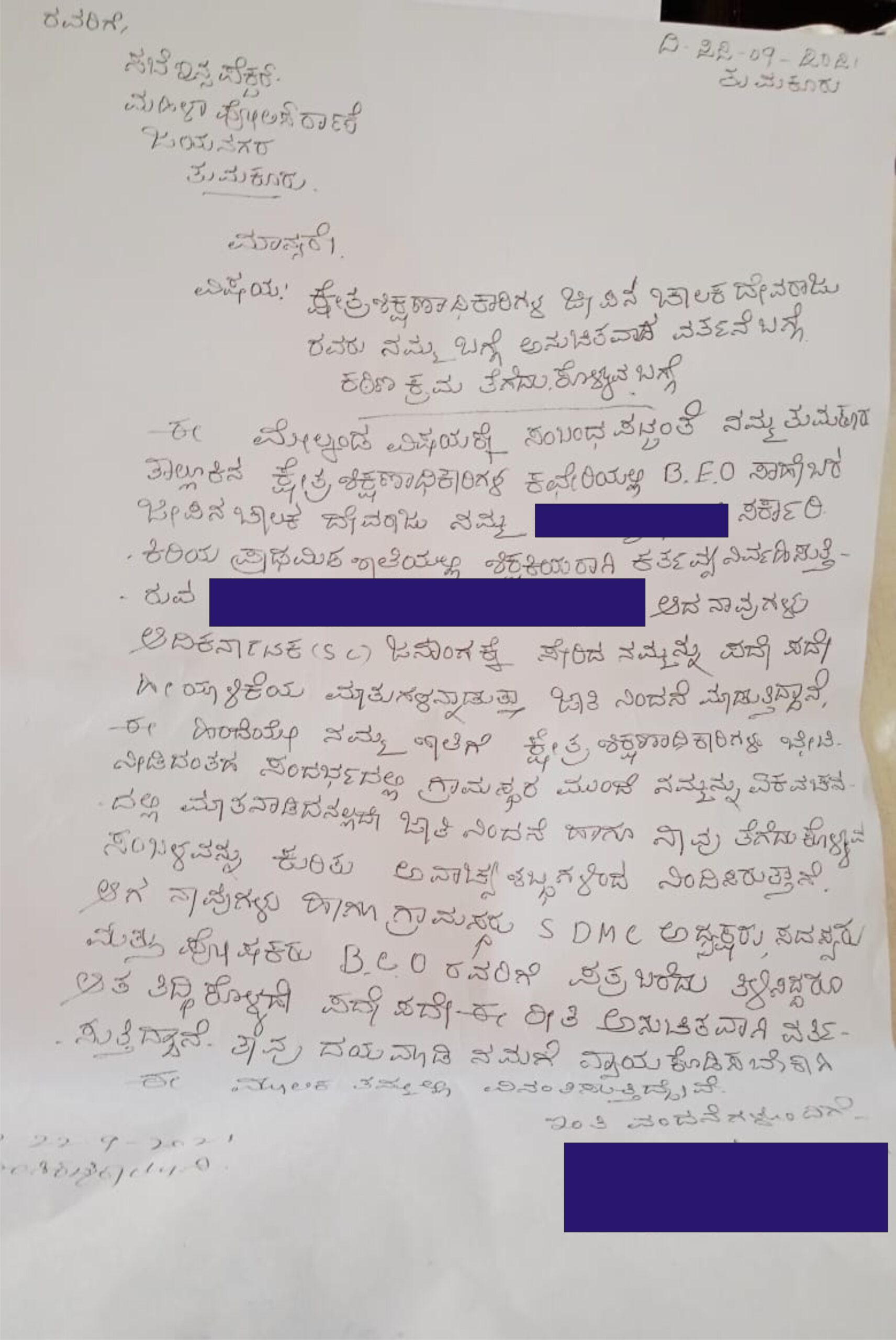 ತುಮಕೂರು ತಾಲ್ಲೂಕು ಕ್ಷೇತ್ರಶಿಕ್ಷಣಾಧಿಕಾರಿ ಜೀಪು ಚಾಲಕ ದೇವರಾಜು ಶಿಕ್ಷಕಿಯರೊಂದಿಗೆ ಅನುಚಿತವಾಗಿ ನಡೆದುಕೊಳ್ಳುವುದೂ ಅಲ್ಲದೆ ಜಾತಿ ನಿಂದನೆ ಮಾಡಿ ಅವಮಾನ ಮಾಡುತ್ತಿದ್ದಾನೆಂದು ಆರೋಪ ಕೇಳಿಬಂದಿದೆ. ಈ ಸಂಬಂಧ ಶಿಕ್ಷಕಿಯರು ಪೊಲೀಸರಿಗೆ ದೂರು ನೀಡಿದರೂ ಎಫ್ಐಆರ್ ದಾಖಲಿಸಲು ಹಿಂದೇಟು ಹಾಕುತ್ತಿದ್ದಾರೆ ಎಂದು ಎಸ್ಎಫ್ಐ ಮತ್ತು ದಲಿತ ಸಂಘಟನೆಗಳು ಆರೋಪಿಸಿವೆ.